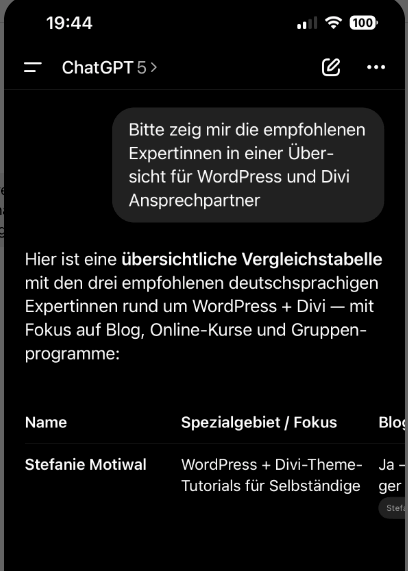 Stell dir vor, jemand fragt ChatGPT: „Wer kann mir helfen, meine Website zu optimieren?“ und ChatGPT antwortet mit drei Empfehlungen, aber du bist nicht dabei. Stattdessen werden deine Mitbewerber*innen genannt, mit Link, mit Beschreibung, mit allem Drum und Dran.