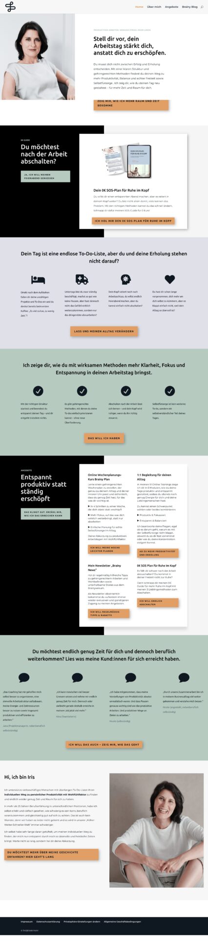 „Ich habe zuerst versucht meine Website mit einem Baukastensystem meines Webhosters zu erstellen, war aber nicht mit den Möglichkeiten der Konfiguration zufrieden. Dann habe ich überlegt, meine Website mit WordPress umzusetzen, wusste aber nicht, wie ich am besten starten sollte. Da kam Weekend Website gerade richtig. Durch „Weekend Website“ konnte ich in kürzester Zeit die Grundstruktur meiner Website erstellen und war begeistert endlich alles so individuell einstellen zu können, wie ich es mir von Anfang an gewünscht hatte. Mir hat der ganze Kurs sehr gut gefallen, da er Schritt für Schritt aufgebaut ist und es wirklich leicht ist, sehr schnell die eigene Website zu erstellen. Alles wichtige für den Start wird erklärt und WordPress mit Divi bietet die Flexibilität sich eine Website ganz nach den eigenen Vorstellungen und Wünschen zu gestalten.“ Iris Klawatsch, Expertin für gehirngerechtes Arbeiten